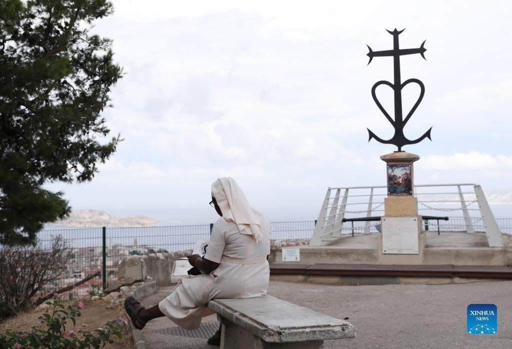 A nun reads a book near the Notre Dame de la Garde Basilica in Marseille, France, Sept. 3, 2021. (Xinhua/Gao Jing)