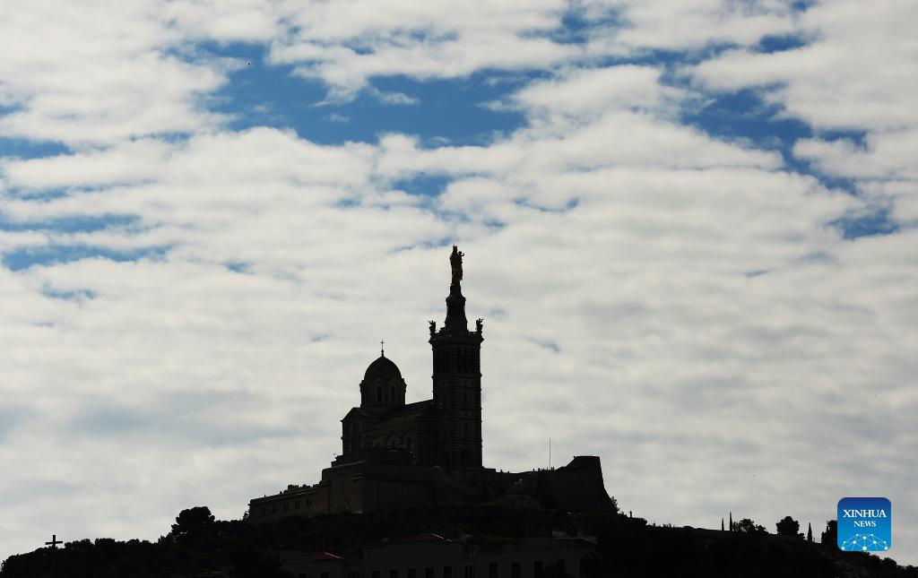 The Notre Dame de la Garde Basilica is seen from the old port in Marseille, France, Sept. 4, 2021. (Xinhua/Gao Jing)