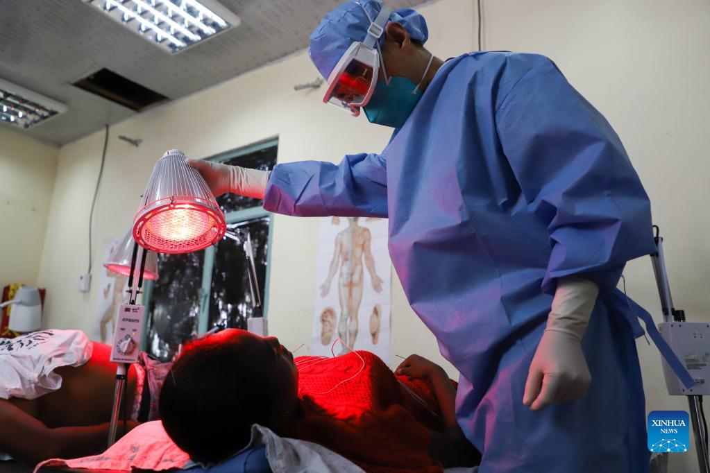 A Chinese acupuncturist treats an Ethiopian patient with acupuncture at Tirunesh Beijing hospital on the outskirts of the Ethiopian capital, Addis Ababa, Aug. 27, 2021. (Xinhua/Michael Tewelde)