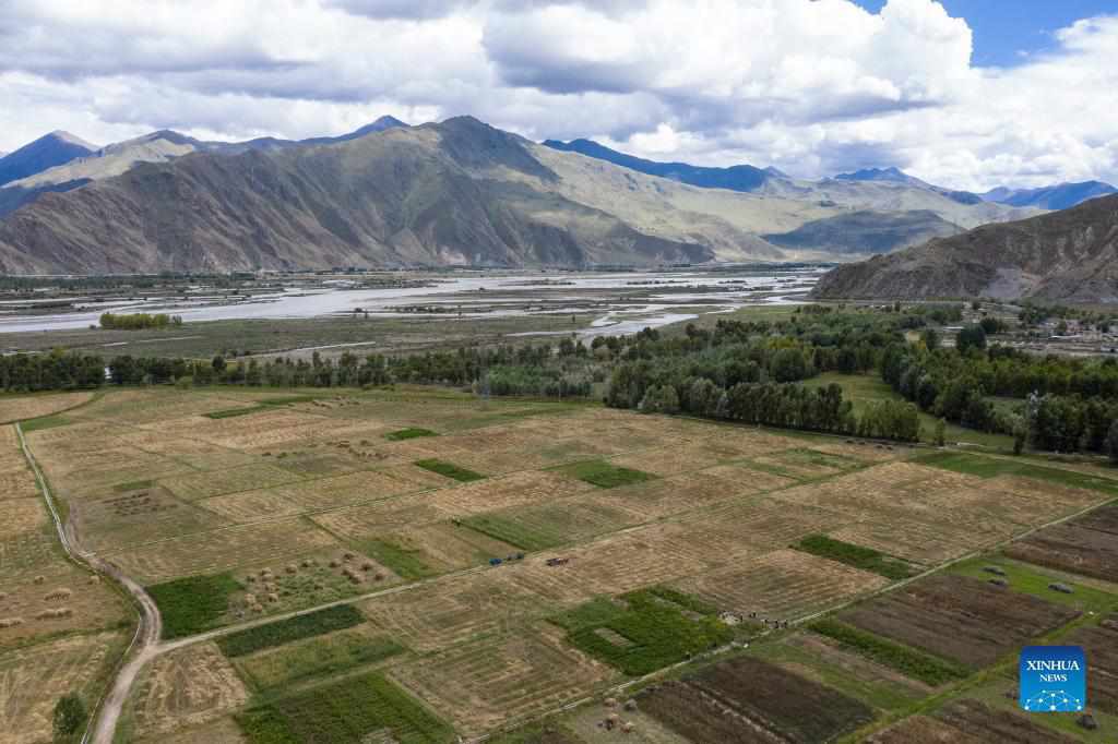 Aerial photo taken on Sept. 6, 2021 shows a highland barley field at Kere Village of Dagze District, Lhasa, capital of southwest China's Tibet Autonomous Region. (Xinhua/Sun Ruibo)