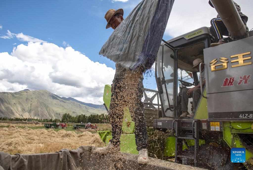 Farmers harvest highland barley at Kere Village of Dagze District, Lhasa, capital of southwest China's Tibet Autonomous Region, Sept. 6, 2021. (Xinhua/Sun Ruibo)