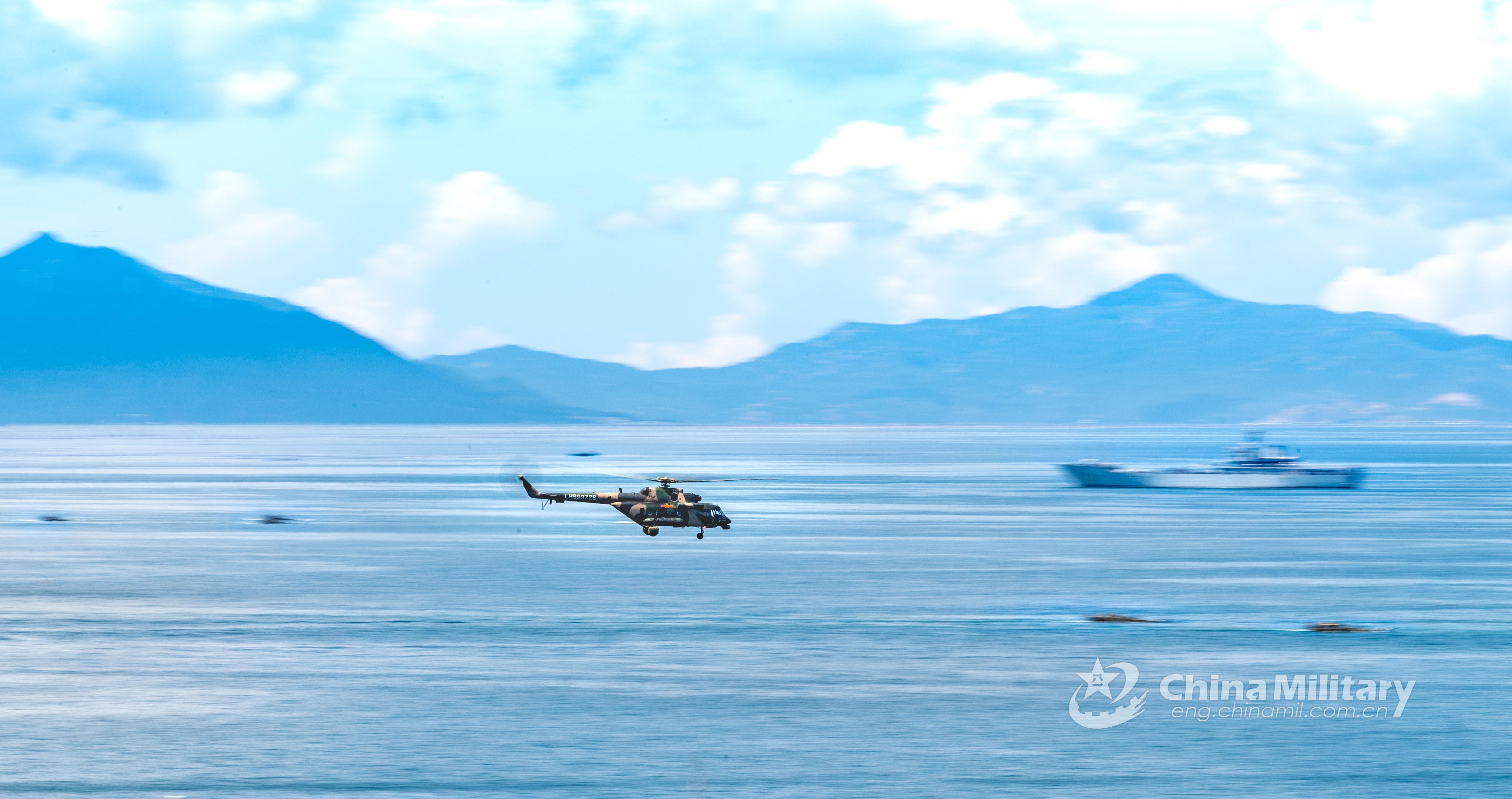 A military helicopter attached to a combined-arms brigade of the army under the PLA Eastern Theater Command flies above the sea for ultra-low-altitude reconnaissance during the landing training on September 4, 2021. (eng.chinamil.com.cn/Photo by Lai Qiaoquan)