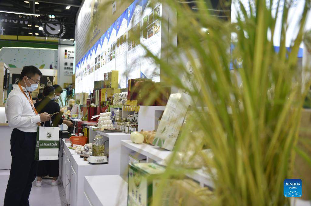 Visitors view agricultural products displayed at the China International Fair for Trade in Services (CIFTIS) in Beijing, capital of China, Sept. 4, 2021. (Xinhua/Lu Peng)