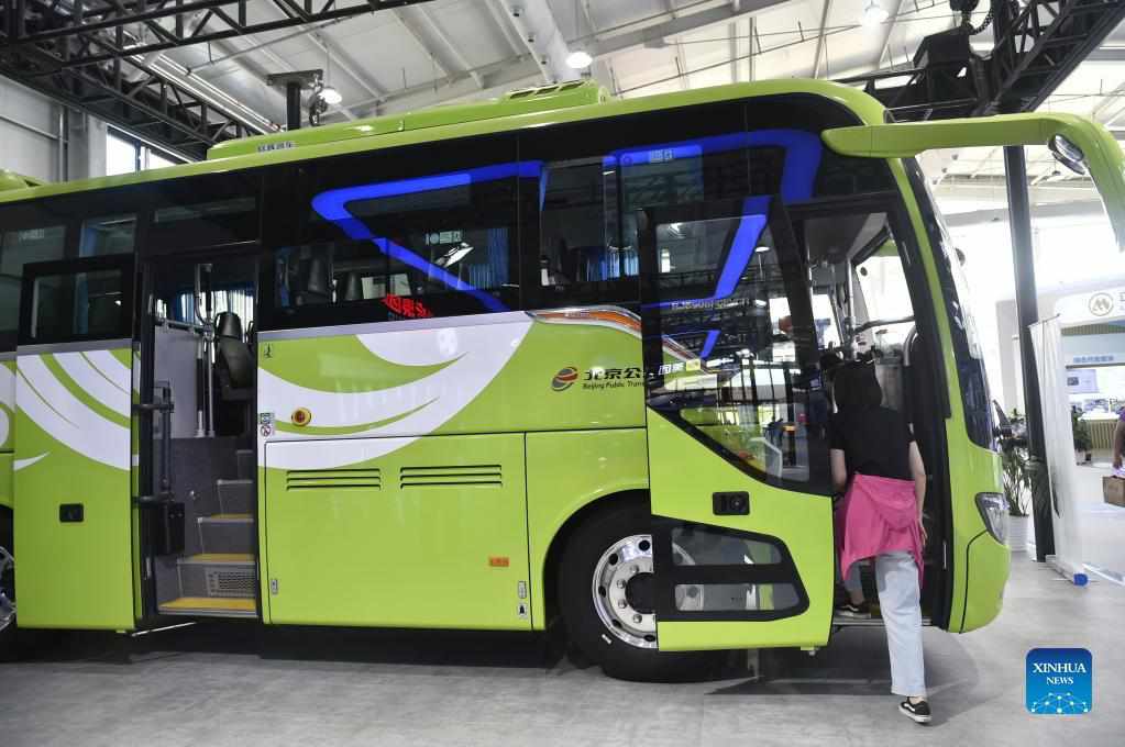 A hydrogen fuel bus is seen at the China International Fair for Trade in Services (CIFTIS) in Beijing, capital of China, Sept. 6, 2021. (Xinhua/Lu Peng)