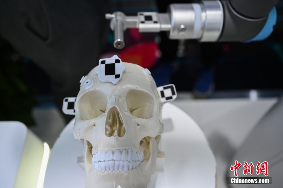A neurosurgical robot conducts simulated operation at the China International Fair for Trade in Services in Beijing, on Sept 3, 2021. (Photo/China News Service)