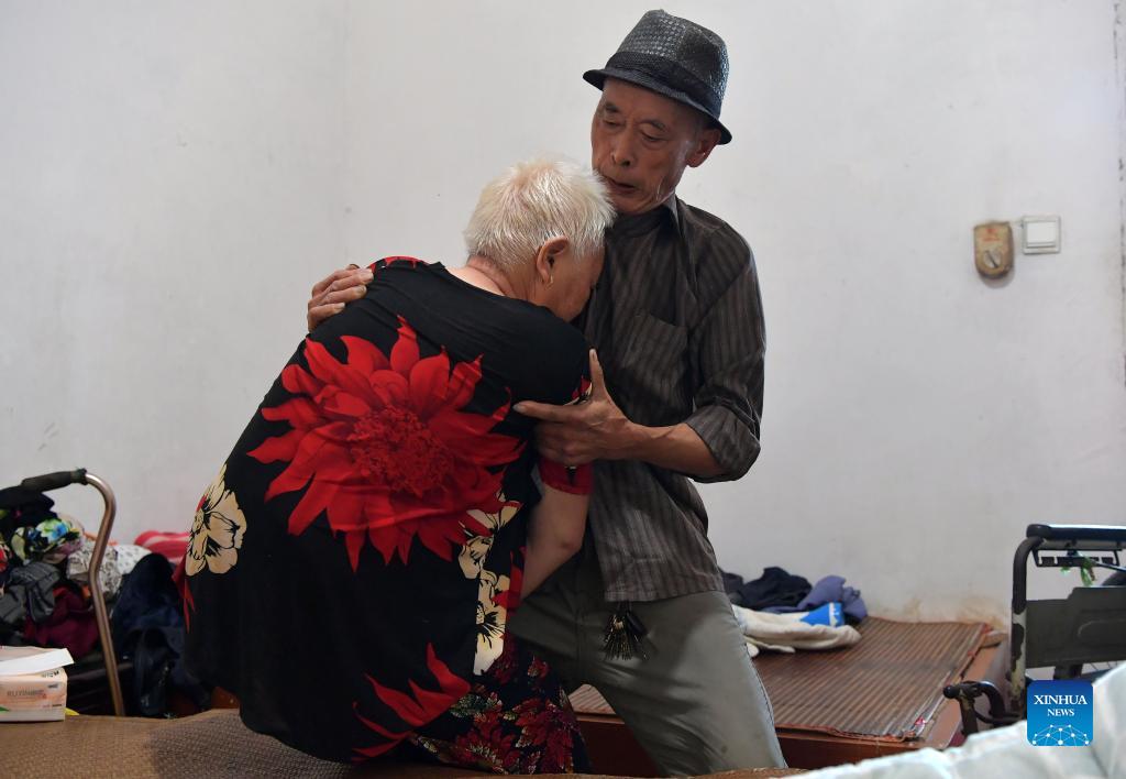 Luo Anmin carries his wife to the wheelchair at Xuluo Village of Nanchang County, east China's Jiangxi Province, Sept. 5, 2021. Luo Anmin is 76 years old. In 2008, his wife Wan Zhaolian suffered from brain cancer and unfortunately lost consciousness, but Luo never gave up. He talked to his wife and gave her massages every day, hoping she can be better off some day. After three years of loving care, the miracle happened. In 2011, Wan Zhaolian regained consciousness, which gave Luo more hope although she still couldn't talk and walk. Luo said he loves his wife so much that he will be always by her side and taking good care of her as long as she is alive. To Luo, his wife means everything, and most importantly, a home. (Xinhua/Peng Zhaozhi)