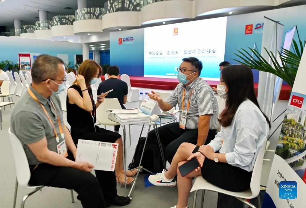 Attendees communicate during the 21st China International Fair for Investment and Trade (CIFIT) in Xiamen, southeast China's Fujian Province, Sept. 8, 2021. The 21st CIFIT launched on Wednesday in Xiamen City. Covering more than 100,000 square meters and with strict anti-epidemic measures in place, the four-day event will attract more than 50,000 business people and over 5,000 companies from nearly 100 countries and regions both online and offline. (Xinhua/Lin Shanchuan)