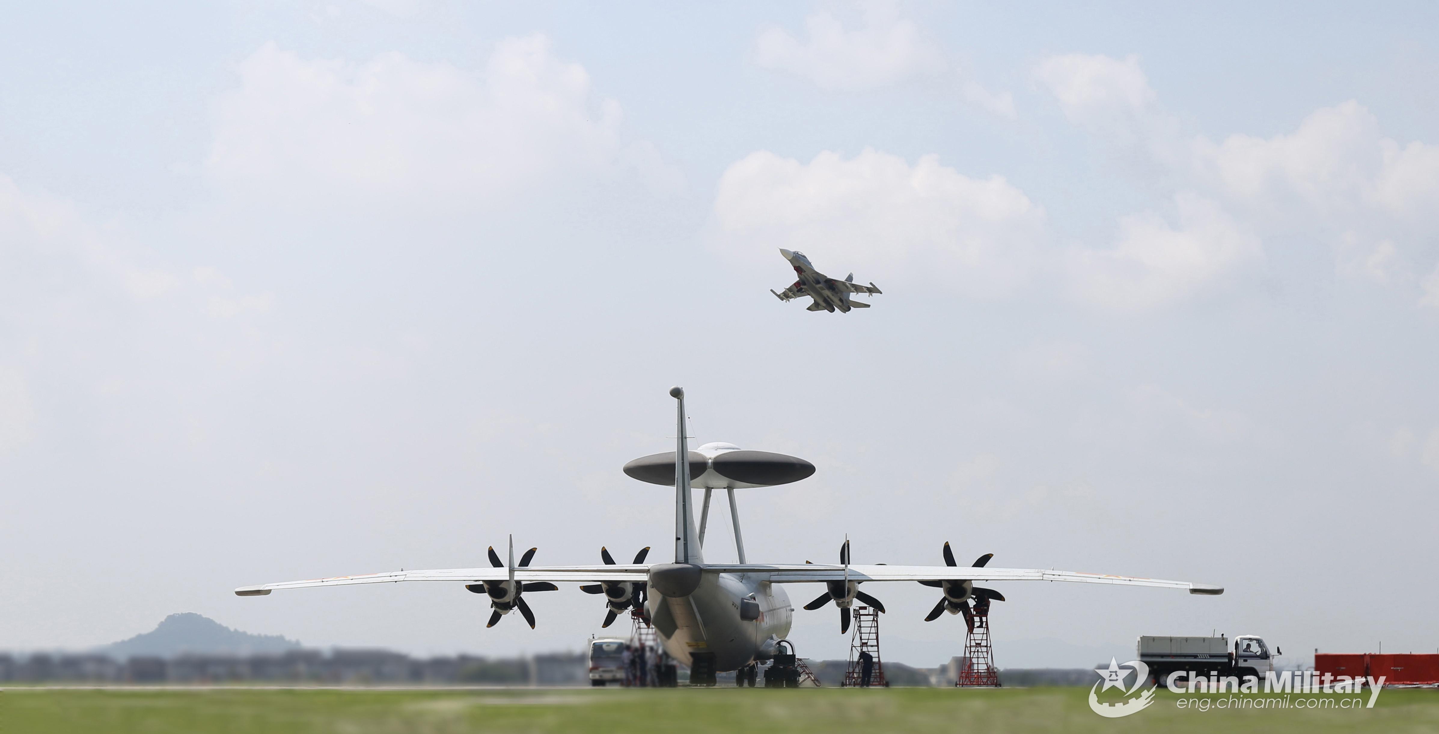 A fighter jet soars into the sky during a coordination flight training exercise conducted by the naval aviation troops under the PLA Eastern Theater Command in late August, 2021. The coordination training aimed to hone the joint combat capability of multi-type warplanes under complex conditions. (eng.chinamil.com.cn/Photo by Deng Peng)
