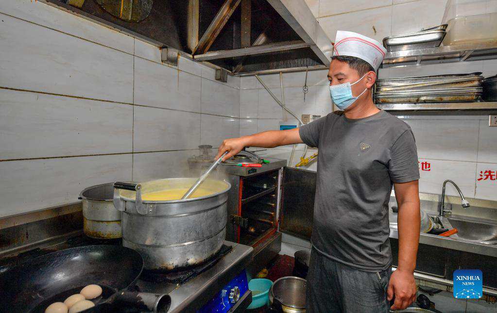 Li Chao prepares breakfast for customers in Xiaoxinmatou Village of Baodi District in Tianjin, north China, Sept. 3, 2021. Li Chao is a post-90s born in Xiaoxinmatou Village in Baodi District. Located by the Chaobai River, the village used to witness an outflow of young people, as villagers made a living by traditional fishing and farming with low income. Like his young fellows, Li chose to be a migrant worker in the city for higher income. Waiter, chef, assembly line worker, security guard and salesman...the diligent man tried his hand at a variety of jobs over the past years, roving the city. In 2013, Li came back to his hometown to get married. A marvelous discovery for him, the small village has been transformed after renovation. Lucid waters, newly-built parks and neat farmyards...all the factors give the village characteristics and advantages to develop rural tourism industry. Witnessing the great changes, Li decided to stay and start an agritainment business in hometown. With the support of a host of favorable policies, the young man started a homestay business and soon expanded it due to excellent trading. "Better environment attracts a growing flow of tourists. During the peak season, rooms in my farmyard will be soon fully booked." Li said, who has been selected as a village commission member. "Now that I have been a member of the village commission, I'd like to do my best and help more fellow villagers to live a comfortable life." (Xinhua/Sun Fanyue)