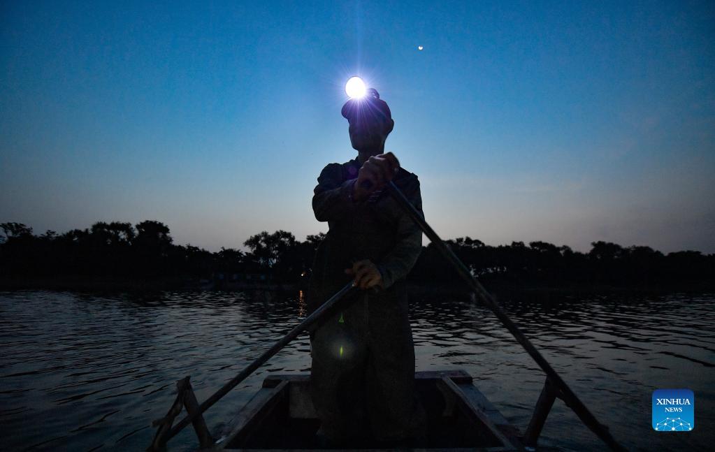 A villager goes fishing on the Chaobai River to prepare ingredients for agritainment business in Xiaoxinmatou Village of Baodi District in Tianjin, north China, Sept. 3, 2021. Li Chao is a post-90s born in Xiaoxinmatou Village in Baodi District. Located by the Chaobai River, the village used to witness an outflow of young people, as villagers made a living by traditional fishing and farming with low income. Like his young fellows, Li chose to be a migrant worker in the city for higher income. Waiter, chef, assembly line worker, security guard and salesman...the diligent man tried his hand at a variety of jobs over the past years, roving the city. In 2013, Li came back to his hometown to get married. A marvelous discovery for him, the small village has been transformed after renovation. Lucid waters, newly-built parks and neat farmyards...all the factors give the village characteristics and advantages to develop rural tourism industry. Witnessing the great changes, Li decided to stay and start an agritainment business in hometown. With the support of a host of favorable policies, the young man started a homestay business and soon expanded it due to excellent trading. "Better environment attracts a growing flow of tourists. During the peak season, rooms in my farmyard will be soon fully booked." Li said, who has been selected as a village commission member. "Now that I have been a member of the village commission, I'd like to do my best and help more fellow villagers to live a comfortable life." (Xinhua/Sun Fanyue)