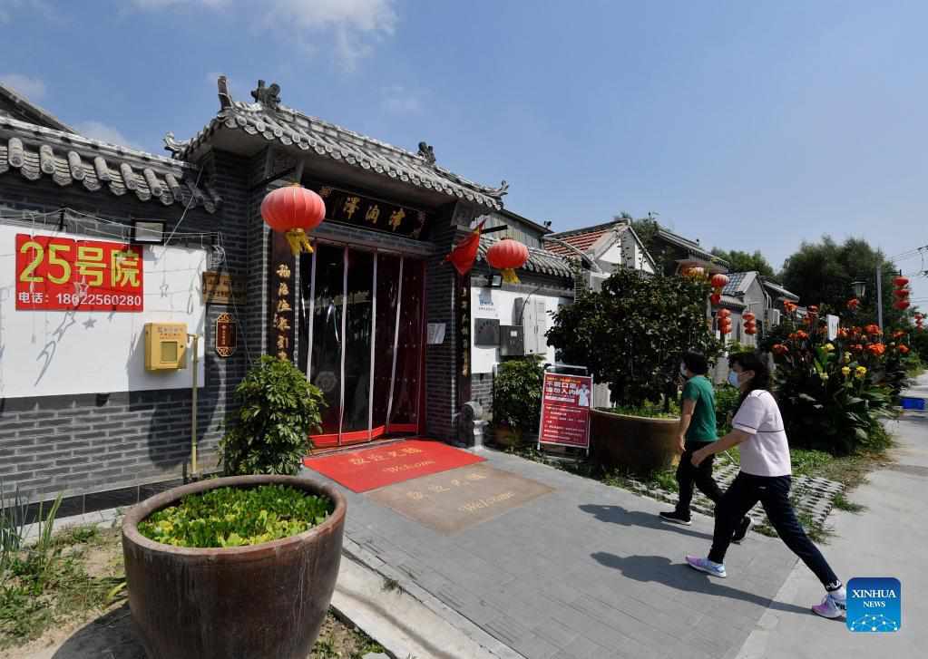 Tourists walk in a farmyard in Xiaoxinmatou Village of Baodi District in Tianjin, north China, Sept. 2, 2021. Li Chao is a post-90s born in Xiaoxinmatou Village in Baodi District. Located by the Chaobai River, the village used to witness an outflow of young people, as villagers made a living by traditional fishing and farming with low income. Like his young fellows, Li chose to be a migrant worker in the city for higher income. Waiter, chef, assembly line worker, security guard and salesman...the diligent man tried his hand at a variety of jobs over the past years, roving the city. In 2013, Li came back to his hometown to get married. A marvelous discovery for him, the small village has been transformed after renovation. Lucid waters, newly-built parks and neat farmyards...all the factors give the village characteristics and advantages to develop rural tourism industry. Witnessing the great changes, Li decided to stay and start an agritainment business in hometown. With the support of a host of favorable policies, the young man started a homestay business and soon expanded it due to excellent trading. "Better environment attracts a growing flow of tourists. During the peak season, rooms in my farmyard will be soon fully booked." Li said, who has been selected as a village commission member. "Now that I have been a member of the village commission, I'd like to do my best and help more fellow villagers to live a comfortable life." (Xinhua/Sun Fanyue)