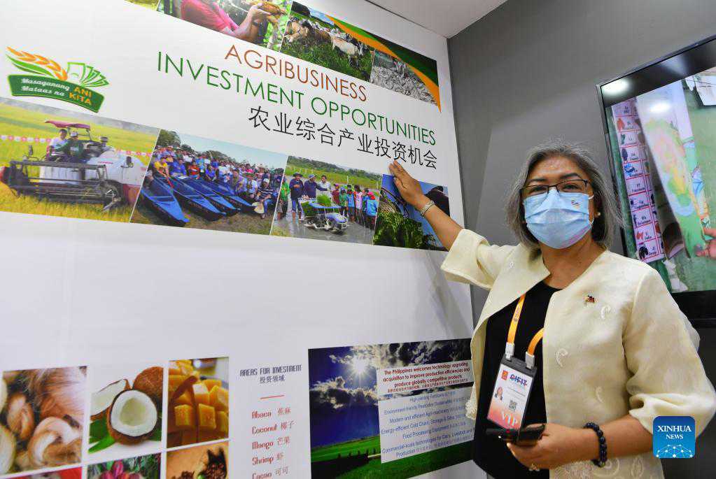 Agriculture Counsellor Ana GM B. Abejuela from Embassy of the Philippines in China introduces the Philippines' investment environment during the 21st China International Fair for Investment and Trade (CIFIT) in Xiamen, southeast China's Fujian Province, Sept. 8, 2021. The 21st CIFIT launched on Wednesday in Xiamen City. Covering more than 100,000 square meters and with strict anti-epidemic measures in place, the four-day event will attract more than 50,000 business people and over 5,000 companies from nearly 100 countries and regions both online and offline. (Xinhua/Wei Peiquan)