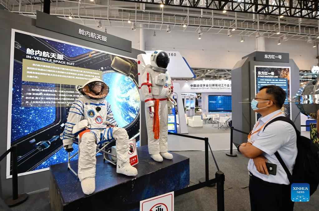 A visitor views In-Vehicle Space Suit during an exhibition on BRICS New Industrial Revolution held in Xiamen, southeast China's Fujian Province, Sept. 8, 2021. An exhibition on BRICS New Industrial Revolution kicked off in Xiamen, a port city in southeast China's Fujian Province on Wednesday. The exhibition covers an area of 10,000 square meters. BRICS is the acronym for an emerging-market bloc that groups Brazil, Russia, India, China and South Africa. (Xinhua/Lin Shanchuan)