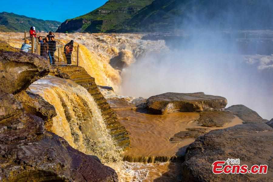 A giant, roaring torrent carrying a large amount of yellow sediment has created a spectacular early autumn scene at Hukou Waterfall, Yellow River in Qinjin Valley. (Photo: China News Service/Lan Hua)