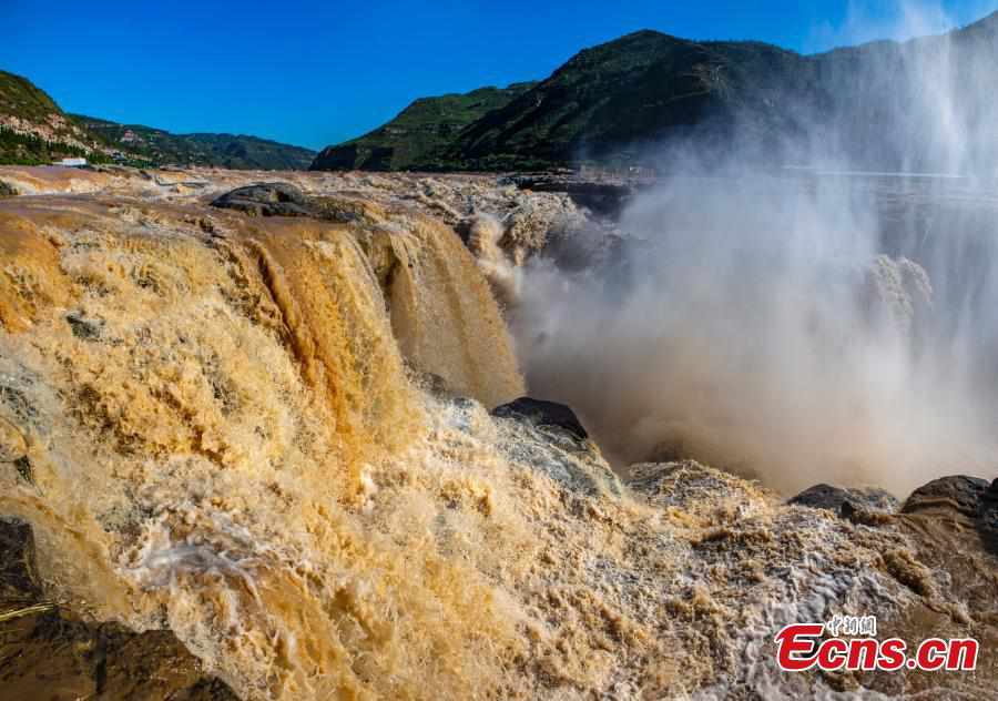 A giant, roaring torrent carrying a large amount of yellow sediment has created a spectacular early autumn scene at Hukou Waterfall, Yellow River in Qinjin Valley. (Photo: China News Service/Lan Hua)