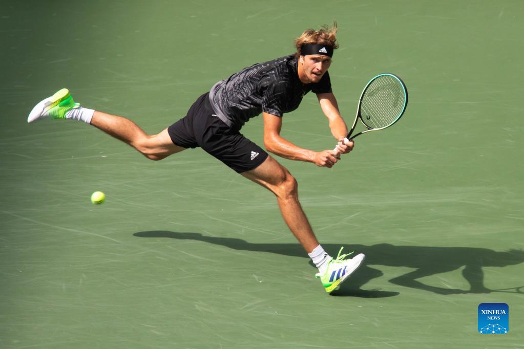 Alexander Zverev of Germany hits a return during the men's singles quarterfinals of the 2021 US Open against Lloyd Harris of South Africa in New York, the United States on Sept. 8, 2021. (Photo by Michael Nagle/Xinhua)
