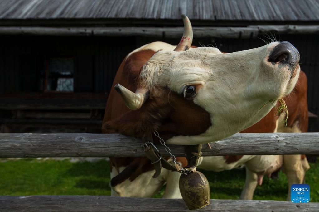 A cow is seen in front of a herdsman hut in Velika planina, Kamnik, Slovenia, Sept. 8, 2021. Velika planina, a large Alpine settlement of shepherds in Europe, is a tourist destination on the Alpine pastures in Slovenia. (Photo by Zeljko Stevanic/Xinhua)