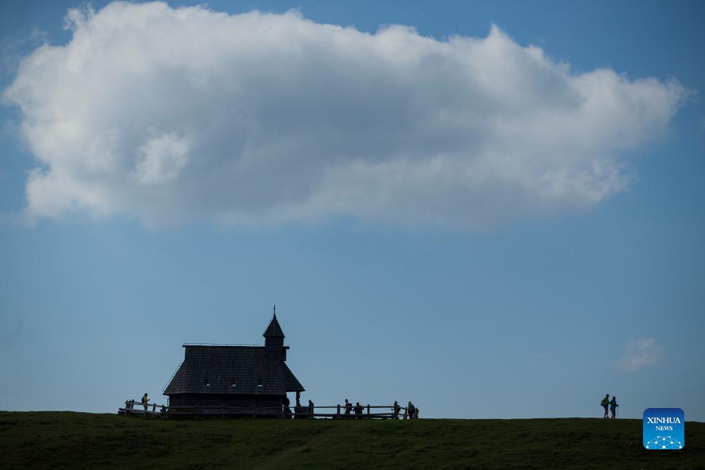 Tourists and the Chapel of Mary of the Snows are seen in Velika planina, Kamnik, Slovenia, Sept. 8, 2021. Velika planina, a large Alpine settlement of shepherds in Europe, is a tourist destination on the Alpine pastures in Slovenia. (Photo by Zeljko Stevanic/Xinhua)