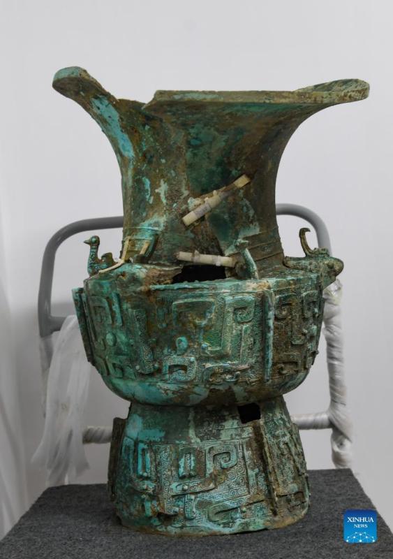 Photo taken on Sept. 2, 2021 shows a Zun, a traditional Chinese bronze ware, discovered at the No. 3 sacrificial pit of the Sanxingdui Ruins site in southwest China's Sichuan Province. More than 500 pieces of relics have been discovered in recent months at the legendary Sanxingdui Ruins site, dazzling archaeologists with their historical value as well as the display of creativity and ingenuity. (Xinhua/Wang Xi)