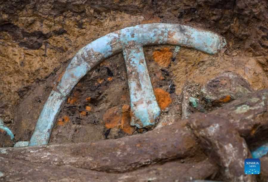 Photo taken on Sept. 2, 2021 shows parts of a bronze ware discovered at the No. 8 sacrificial pit of the Sanxingdui Ruins site in southwest China's Sichuan Province. More than 500 pieces of relics have been discovered in recent months at the legendary Sanxingdui Ruins site, dazzling archaeologists with their historical value as well as the display of creativity and ingenuity. (Xinhua/Wang Xi)