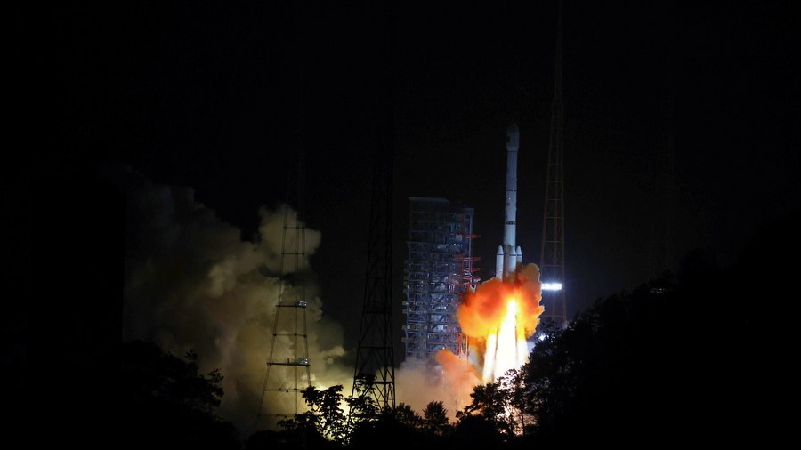 A Long March-3B carrier rocket carrying the Zhongxing-9B satellite blasts off from the Xichang Satellite Launch Center in southwest China's Sichuan Province, Sept. 9, 2021. (Photo by Bai Xiaofei/Xinhua)