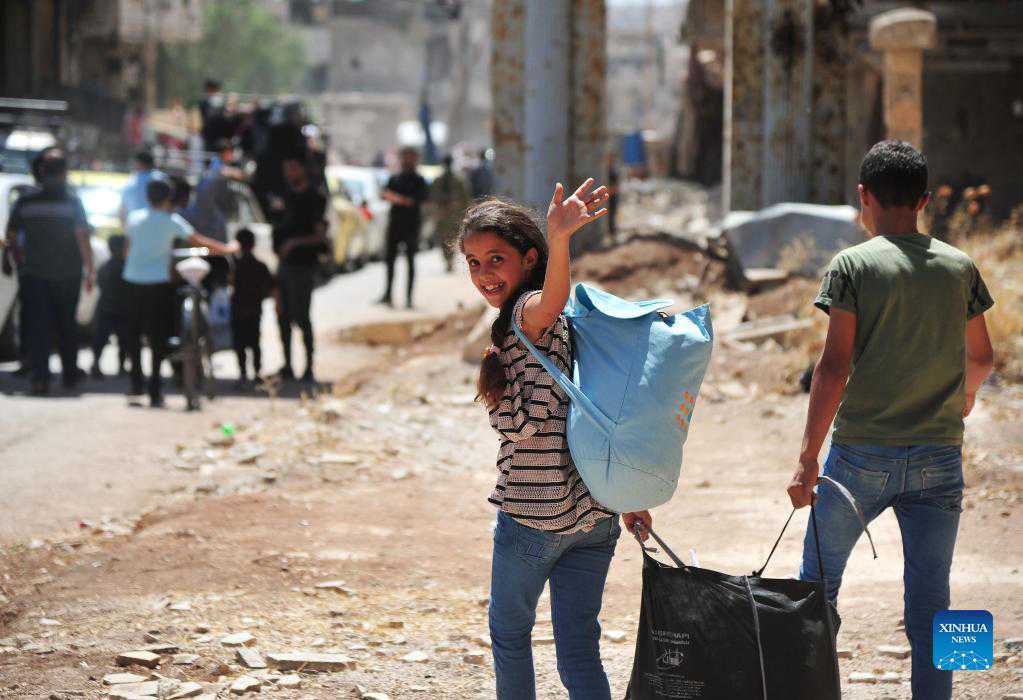People return to their homes in Syria's southern province of Daraa, on Sept. 9, 2021. Thousands of people started returning to their homes in Daraa on Thursday following the army's entry to the formerly rebel-held areas, state news agency SANA reported. (Photo by Ammar Safarjalani/Xinhua)