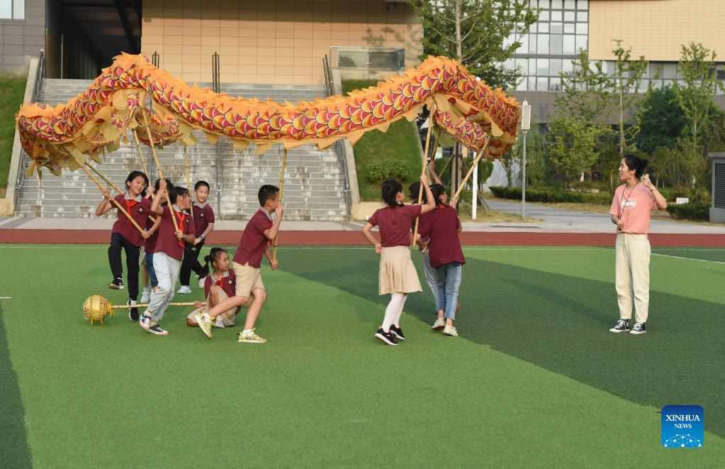 Wang Ling (1st, R) instructs her students at the dragon and lion dance club at Heping Primary School in Hefei City, east China's Anhui Province, Sept. 8, 2021. Wang Ling, a music teacher from Heping Primary School, is passionate about Chinese traditional culture. Now she is in charge of teaching students to practice dragon and lion dance at an after-school club, hoping to enhance their team cohesiveness through this traditional activity. (Xinhua/Zhou Mu)