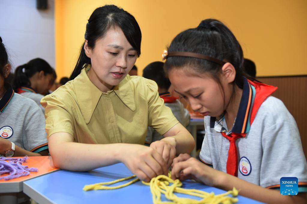Zhao Xun (L) instructs a student in knitting techniques at the knitting club at Luogang Primary School in Hefei City, east China's Anhui Province, Sept. 8, 2021. Zhao Xun, a teacher of Chinese from Luogang Primary School, also a knitting enthusiast, sets up a knitting club and teaches her students handwork knitting during after-school time. (Xinhua/Zhou Mu)