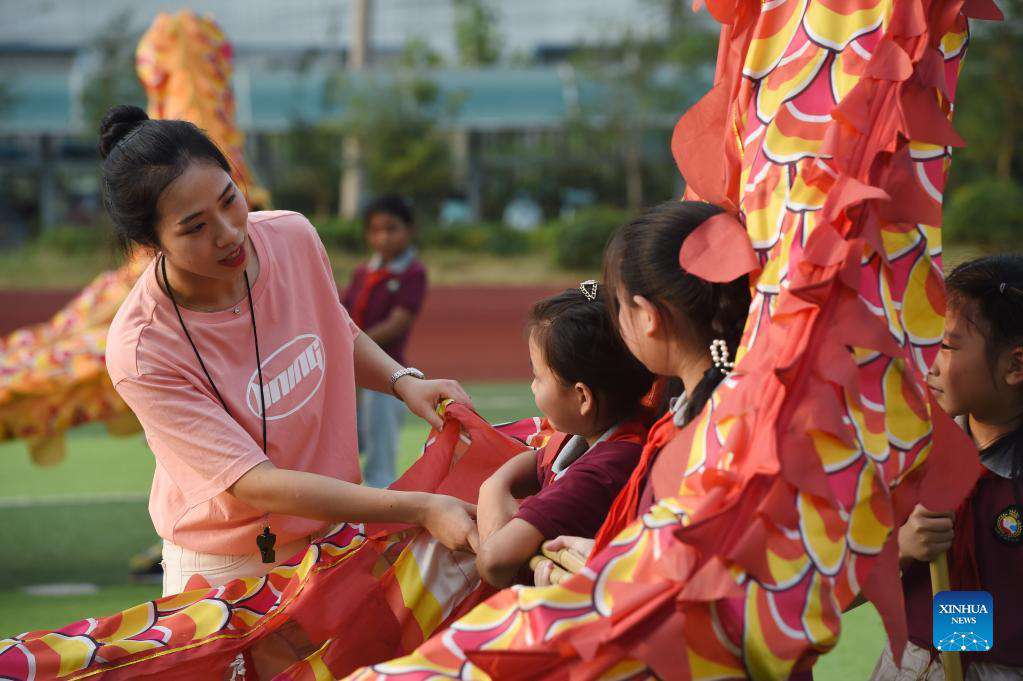 Wang Ling (L) instructs her students at the dragon and lion dance club at Heping Primary School in Hefei City, east China's Anhui Province, Sept. 8, 2021. Wang Ling, a music teacher from Heping Primary School, is passionate about Chinese traditional culture. Now she is in charge of teaching students to practice dragon and lion dance at an after-school club, hoping to enhance their team cohesiveness through this traditional activity. (Xinhua/Zhou Mu)