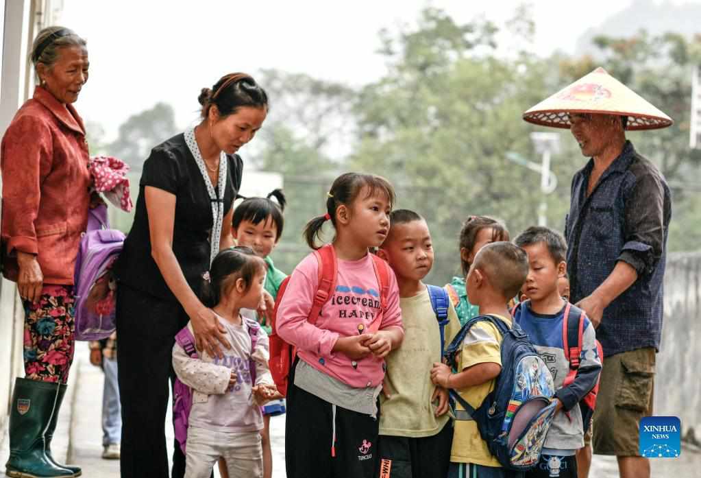 Zhu Muqun (2nd, L) organizes the children to line up before they leaving school at Pingyu teaching point of Songbai Village, Baojing Township of Zhenyuan County, southwest China's Guizhou Province, Sept. 7, 2021. Located deep in the mountainous area of Zhenyuan County, Qiandongnan Miao and Dong Autonomous Prefecture, southwest China's Guizhou Province, the Pingyu teaching point is supported mainly by a couple. In 2000, Pan Zhongyong graduated from a normal school and came to Pingyu teaching point as a teacher. Later, he met and married Zhu Muqun, a girl in the village. Over the years, the couple was responsible for teaching, safety management, cooking and so on. With the integration of local educational resources in recent years, the number of students in Pingyu teaching point has been decreasing. There are only 20 lower-grade students at the teaching point this semester. Nevertheless, the couple decides to stay as teachers to bring convenience for the children and their parents. (Xinhua/Yang Wenbin)
