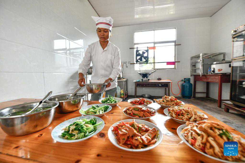 Zhu Muqun prepares a meal for students at Pingyu teaching point of Songbai Village, Baojing Township of Zhenyuan County, southwest China's Guizhou Province, Sept. 8, 2021. Located deep in the mountainous area of Zhenyuan County, Qiandongnan Miao and Dong Autonomous Prefecture, southwest China's Guizhou Province, the Pingyu teaching point is supported mainly by a couple. In 2000, Pan Zhongyong graduated from a normal school and came to Pingyu teaching point as a teacher. Later, he met and married Zhu Muqun, a girl in the village. Over the years, the couple was responsible for teaching, safety management, cooking and so on. With the integration of local educational resources in recent years, the number of students in Pingyu teaching point has been decreasing. There are only 20 lower-grade students at the teaching point this semester. Nevertheless, the couple decides to stay as teachers to bring convenience for the children and their parents. (Xinhua/Yang Wenbin)