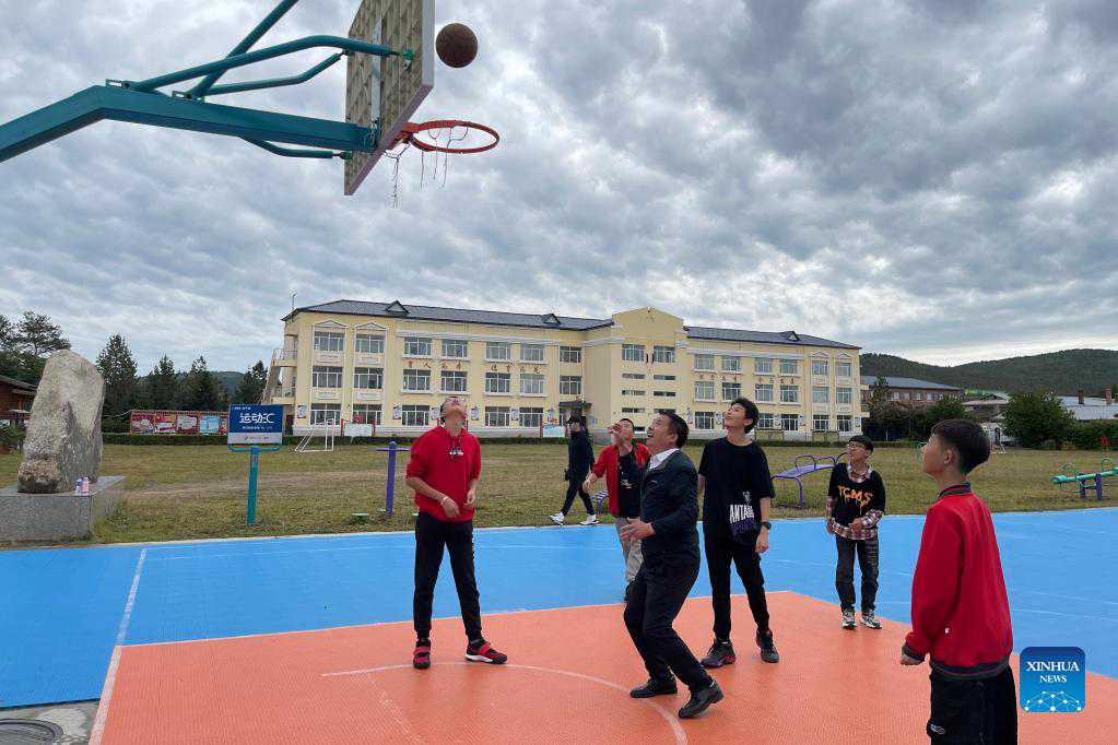 Photo taken with a mobile phone on Sept. 6, 2021 shows Ma Jianguo playing basketball with students at Beiji central school in Beiji Village of Mohe City, northeast China's Heilongjiang Province. Ma Jianguo is the principal of Beiji central school in Beiji Village, also known as the arctic village. In 1997, Ma came to Mohe and became a village teacher after graduating from university. When he first came here, the school was lack of teachers. Thus, Ma has taught different subjects since then. Over the years, a lot of teachers have left the school, but Ma stayed because he believed underprivileged students need good teachers more. Since 2013, Ma has served as the principal of the school. The number of students has increased from the least 120 to more than 160. (Xinhua/Yang Siqi)