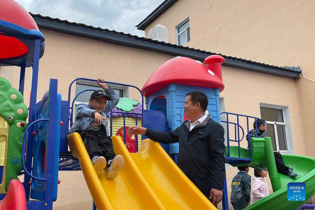 Photo taken with a mobile phone on Sept. 6, 2021 shows Ma Jianguo playing with a student at Beiji central school in Beiji Village of Mohe City, northeast China's Heilongjiang Province. Ma Jianguo is the principal of Beiji central school in Beiji Village, also known as the arctic village. In 1997, Ma came to Mohe and became a village teacher after graduating from university. When he first came here, the school was lack of teachers. Thus, Ma has taught different subjects since then. Over the years, a lot of teachers have left the school, but Ma stayed because he believed underprivileged students need good teachers more. Since 2013, Ma has served as the principal of the school. The number of students has increased from the least 120 to more than 160. (Xinhua/Yang Siqi)