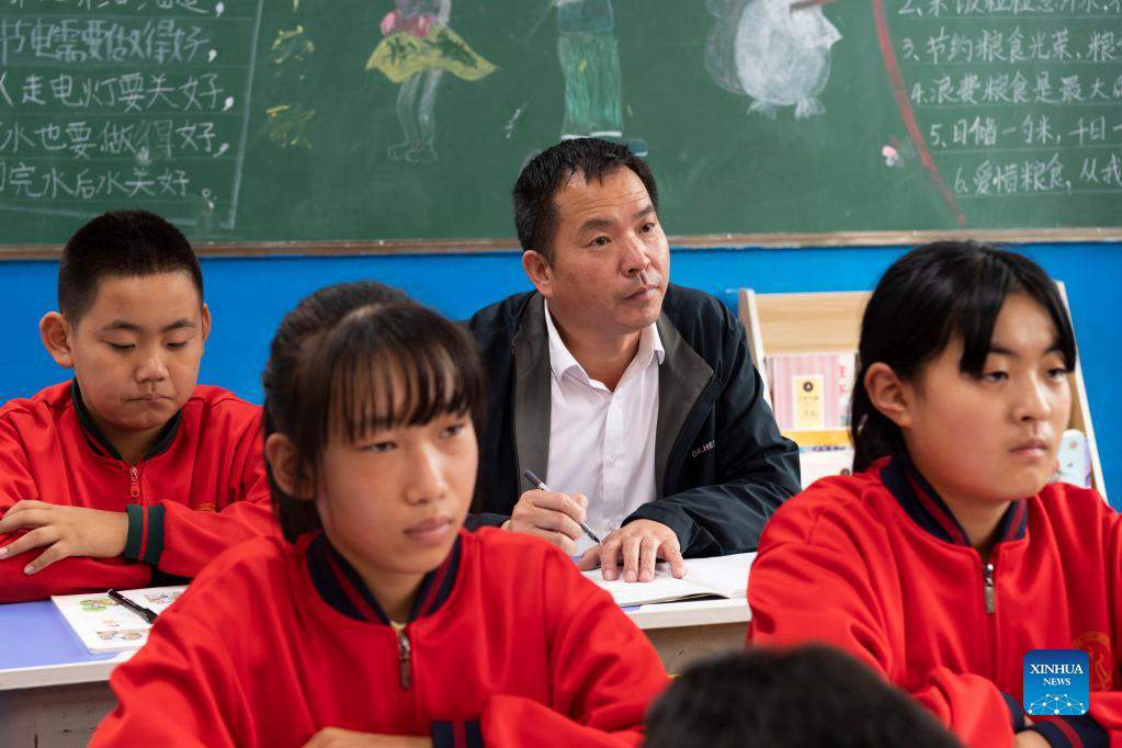 Ma Jianguo attends class with students at Beiji central school in Beiji Village of Mohe City, northeast China's Heilongjiang Province, Sept. 6, 2021. Ma Jianguo is the principal of Beiji central school in Beiji Village, also known as the arctic village. In 1997, Ma came to Mohe and became a village teacher after graduating from university. When he first came here, the school was lack of teachers. Thus, Ma has taught different subjects since then. Over the years, a lot of teachers have left the school, but Ma stayed because he believed underprivileged students need good teachers more. Since 2013, Ma has served as the principal of the school. The number of students has increased from the least 120 to more than 160. (Xinhua/Xie Jianfei)