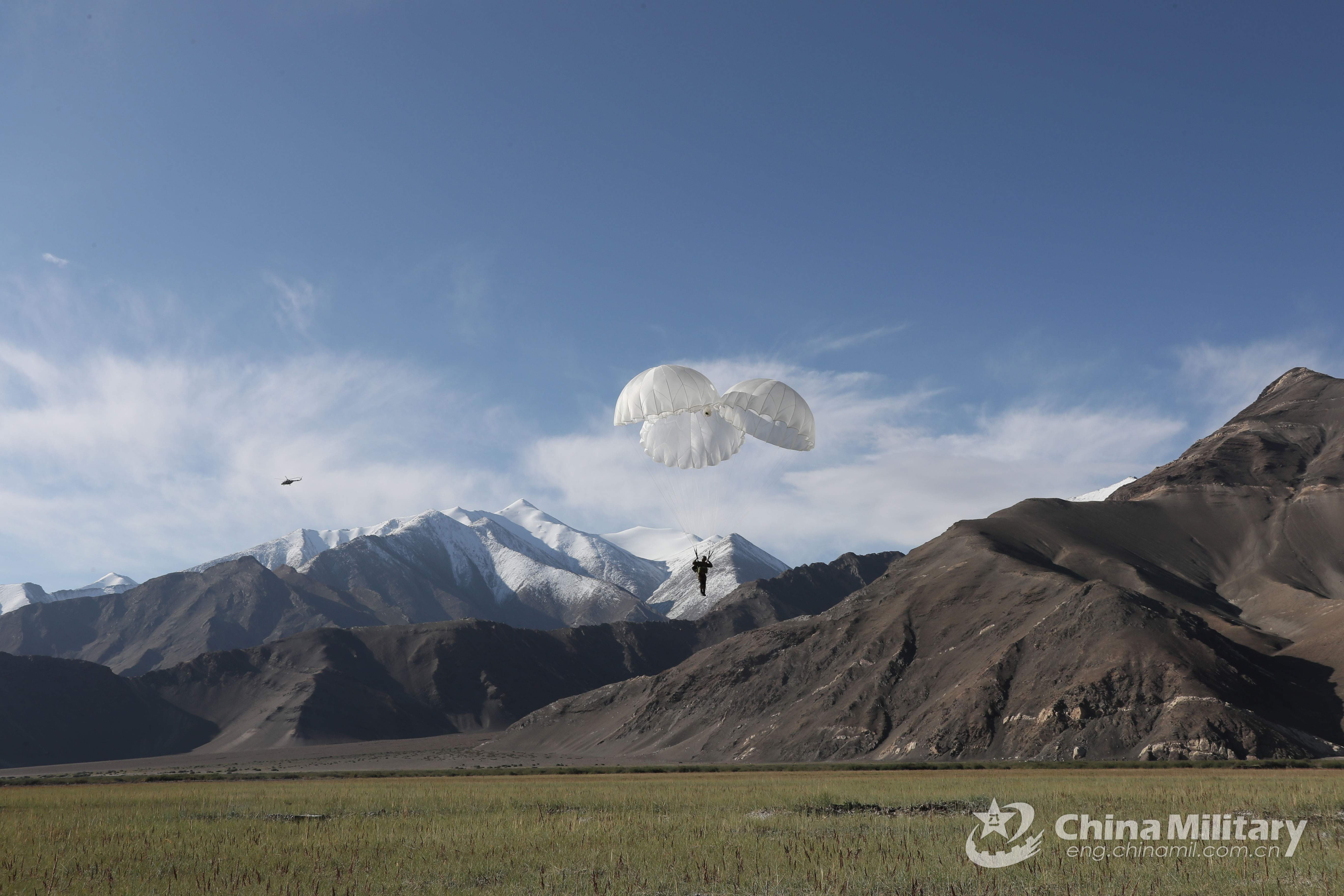 A paratrooper assigned to a special operations brigade under the PLA Xinjiang Military Command controls his parachute to reach the drop zone during a parachuting training exercise on August 31, 2021. This exercise effectively beefed up the troops' operation skills in plateau area. (eng.chinamil.com.cn/Photo by Shan Chuangyang)