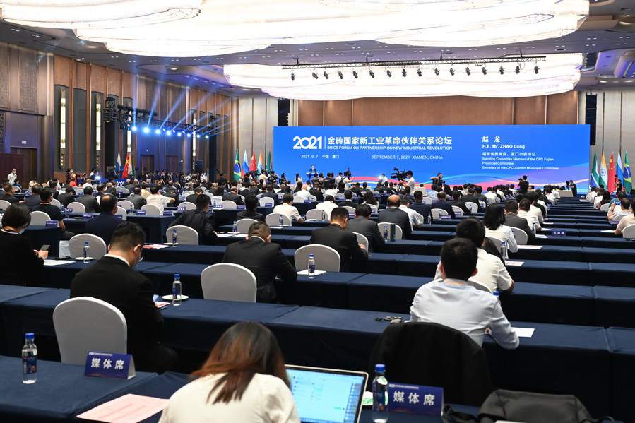 Photo taken on Sept. 7, 2021 shows the venue of the BRICS Forum on Partnership on New Industrial Revolution in Xiamen, southeast China's Fujian Province. (Xinhua/Lin Shanchuan)