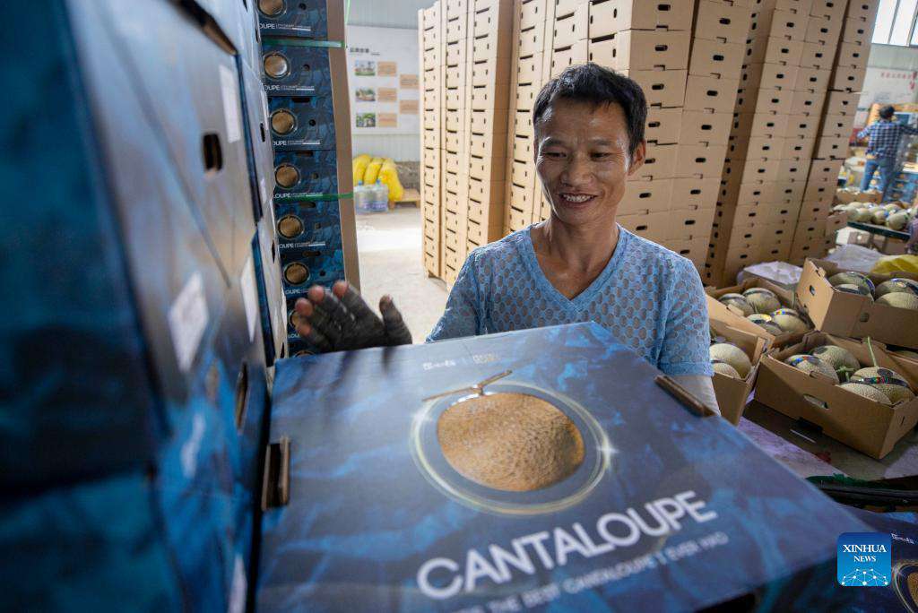 A farmer packs cantaloupes at a cantaloupe farm in Lingwu, northwest China's Ningxia Hui Autonomous Region, Sept. 8, 2021. (Xinhua/Yang Zhisen)