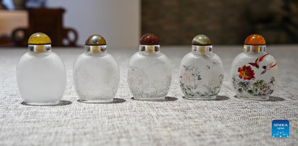 Photo taken on Sept. 4, 2021 shows the different stages of the inside painting creation at a museum featuring inside painting in Taocheng District of Hengshui City, north China's Hebei Province. Inside painting, or inner painting, is a traditional Chinese art form. It originally involves tiny snuff bottles which have pictures and calligraphy painted on the inside surface of the bottle. Snuff bottle paintings are produced by manipulating a specialized brush through the neck of the bottle. The process of painting, which is totally reversed inside the bottle, requires absolute precision from the artist. Wang Ziyong, 52, an inside painting craftsman, studied inside painting with his father Wang Ruicheng since childhood. After graduating from college, Wang returned to Hengshui City and devoted himself to the artwork. Thanks to years of practice, he quickly developed his own style. In order to better paint the color highlights and handle details, Wang developed a new type of brush, which improved the drawing efficiency. He also developed different styles to create inside painting, not only inside snuff bottles, but also inside pencil vases, crystal balls, tea sets and folding screens. In 1995, he gave up the traditional workshop-style production mode of inside painting and established a modern enterprise, integrating development, design, production, processing and sales of the artwork. In 2003, with the help of his father, Wang founded a museum in Hebei themed on inside paintings, showing the historical development and creative process of the art. In 2006, inside painting was added to the list of national intangible cultural heritages. In 2012, Wang Ziyong was named the inheritor of provincial intangible cultural heritage projects. During all these years, Wang has won many prizes with his innovative artwork, and offered training to 38 apprentices, trying to make this traditional skill shine a new light. "I hope more people can feel the charm of Hengshui inside painting in the future," Wang said. (Xinhua/Jin Haoyuan)