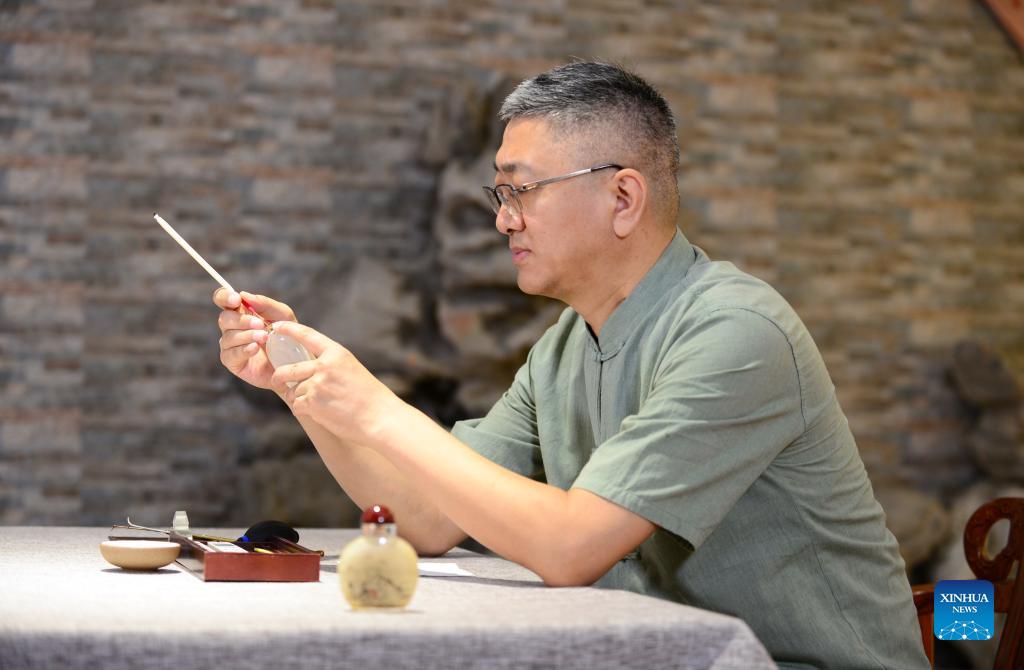 Wang Ziyong creates inside painting works at a museum featuring inside paintings in Taocheng District of Hengshui City, north China's Hebei Province, Sept. 1, 2021. Inside painting, or inner painting, is a traditional Chinese art form. It originally involves tiny snuff bottles which have pictures and calligraphy painted on the inside surface of the bottle. Snuff bottle paintings are produced by manipulating a specialized brush through the neck of the bottle. The process of painting, which is totally reversed inside the bottle, requires absolute precision from the artist. Wang Ziyong, 52, an inside painting craftsman, studied inside painting with his father Wang Ruicheng since childhood. After graduating from college, Wang returned to Hengshui City and devoted himself to the artwork. Thanks to years of practice, he quickly developed his own style. In order to better paint the color highlights and handle details, Wang developed a new type of brush, which improved the drawing efficiency. He also developed different styles to create inside painting, not only inside snuff bottles, but also inside pencil vases, crystal balls, tea sets and folding screens. In 1995, he gave up the traditional workshop-style production mode of inside painting and established a modern enterprise, integrating development, design, production, processing and sales of the artwork. In 2003, with the help of his father, Wang founded a museum in Hebei themed on inside paintings, showing the historical development and creative process of the art. In 2006, inside painting was added to the list of national intangible cultural heritages. In 2012, Wang Ziyong was named the inheritor of provincial intangible cultural heritage projects. During all these years, Wang has won many prizes with his innovative artwork, and offered training to 38 apprentices, trying to make this traditional skill shine a new light. "I hope more people can feel the charm of Hengshui inside painting in the future," Wang said. (Xinhua/Jin Haoyuan)