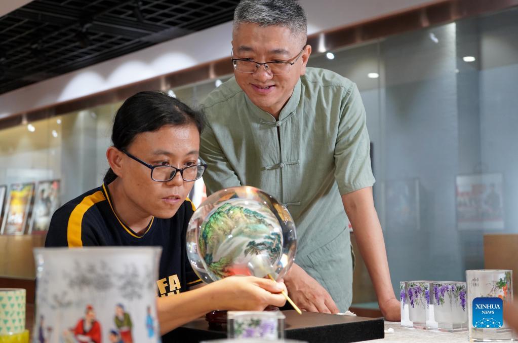 Wang Ziyong (R) directs an apprentices to create inside painting works at a museum featuring inside paintings in Taocheng District of Hengshui City, north China's Hebei Province, Sept. 1, 2021. Inside painting, or inner painting, is a traditional Chinese art form. It originally involves tiny snuff bottles which have pictures and calligraphy painted on the inside surface of the bottle. Snuff bottle paintings are produced by manipulating a specialized brush through the neck of the bottle. The process of painting, which is totally reversed inside the bottle, requires absolute precision from the artist. Wang Ziyong, 52, an inside painting craftsman, studied inside painting with his father Wang Ruicheng since childhood. After graduating from college, Wang returned to Hengshui City and devoted himself to the artwork. Thanks to years of practice, he quickly developed his own style. In order to better paint the color highlights and handle details, Wang developed a new type of brush, which improved the drawing efficiency. He also developed different styles to create inside painting, not only inside snuff bottles, but also inside pencil vases, crystal balls, tea sets and folding screens. In 1995, he gave up the traditional workshop-style production mode of inside painting and established a modern enterprise, integrating development, design, production, processing and sales of the artwork. In 2003, with the help of his father, Wang founded a museum in Hebei themed on inside paintings, showing the historical development and creative process of the art. In 2006, inside painting was added to the list of national intangible cultural heritages. In 2012, Wang Ziyong was named the inheritor of provincial intangible cultural heritage projects. During all these years, Wang has won many prizes with his innovative artwork, and offered training to 38 apprentices, trying to make this traditional skill shine a new light. "I hope more people can feel the charm of Hengshui inside painting in the future," Wang said. (Xinhua/Jin Haoyuan)