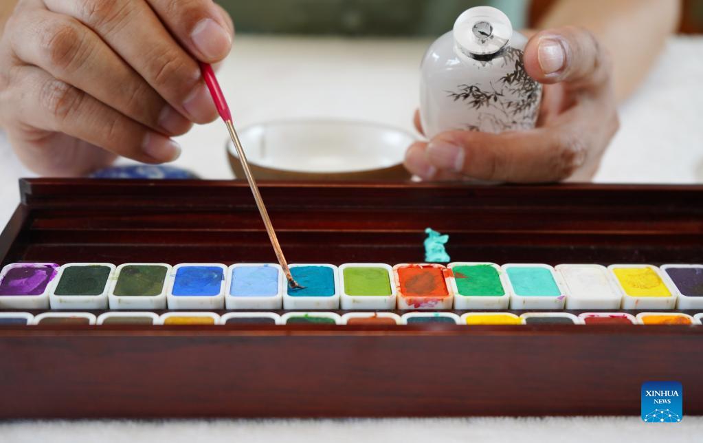 Wang Ziyong creates inside painting works at a museum featuring inside paintings in Taocheng District of Hengshui City, north China's Hebei Province, Sept. 4, 2021. Inside painting, or inner painting, is a traditional Chinese art form. It originally involves tiny snuff bottles which have pictures and calligraphy painted on the inside surface of the bottle. Snuff bottle paintings are produced by manipulating a specialized brush through the neck of the bottle. The process of painting, which is totally reversed inside the bottle, requires absolute precision from the artist. Wang Ziyong, 52, an inside painting craftsman, studied inside painting with his father Wang Ruicheng since childhood. After graduating from college, Wang returned to Hengshui City and devoted himself to the artwork. Thanks to years of practice, he quickly developed his own style. In order to better paint the color highlights and handle details, Wang developed a new type of brush, which improved the drawing efficiency. He also developed different styles to create inside painting, not only inside snuff bottles, but also inside pencil vases, crystal balls, tea sets and folding screens. In 1995, he gave up the traditional workshop-style production mode of inside painting and established a modern enterprise, integrating development, design, production, processing and sales of the artwork. In 2003, with the help of his father, Wang founded a museum in Hebei themed on inside paintings, showing the historical development and creative process of the art. In 2006, inside painting was added to the list of national intangible cultural heritages. In 2012, Wang Ziyong was named the inheritor of provincial intangible cultural heritage projects. During all these years, Wang has won many prizes with his innovative artwork, and offered training to 38 apprentices, trying to make this traditional skill shine a new light. "I hope more people can feel the charm of Hengshui inside painting in the future," Wang said. (Xinhua/Jin Haoyuan)