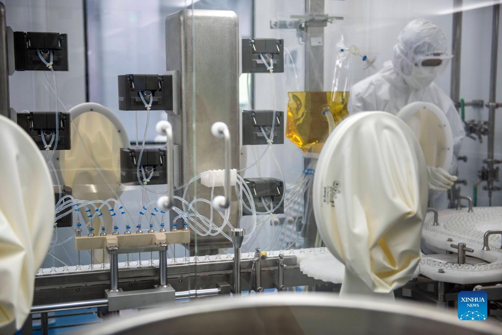 A technician operates during a test run of the "fill and finish" process for CanSino vaccine at Solution Biologics factory in Kuala Lumpur, Malaysia, Sept. 8, 2021. Chinese company CanSino Biologics has helped Malaysia cross another milestone in vaccine manufacturing, this time by transferring technology to enable the local "fill and finish" of the COVID-19 vaccine based on the adenovirus platform. Malaysian pharmaceutical company Solution Biologics deputy group managing director Mohd Nazlee Kamal told Xinhua that close and friendly cooperation with CanSino has made the venture possible. (Photo by Chong Voon Chung/Xinhua)