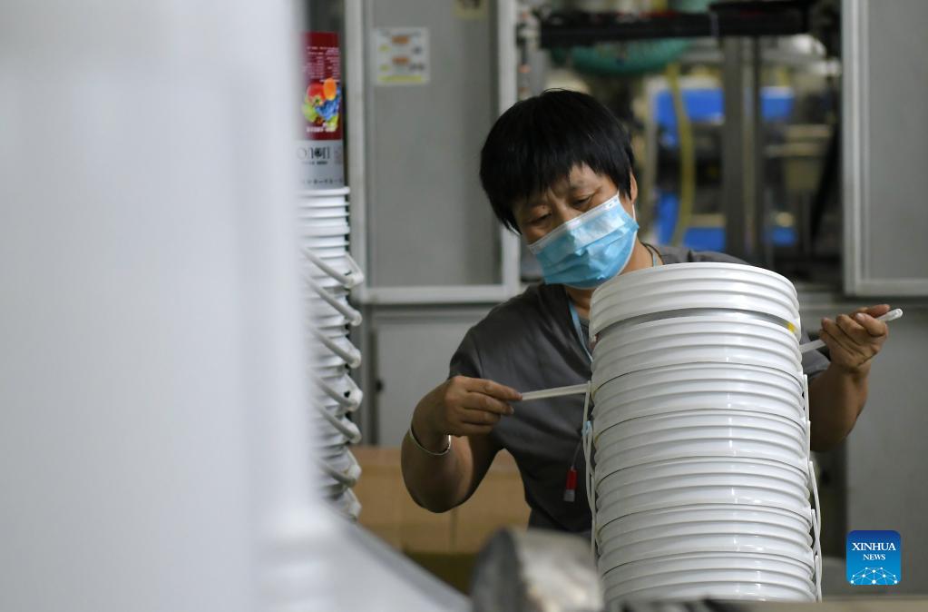 A staff member works at a pharmaceutical packaging material enterprise in Cangxian County, north China's Hebei Province, Sept. 9, 2021. There are more than 1,000 pharmaceutical packaging materials manufacturers in Cangxian County. (Xinhua/Luo Xuefeng)