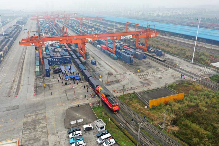 Aerial photo shows a China-Europe freight train bound for Duisburg of Germany departing from Tuanjiecun Railway Station in southwest China's Chongqing, Jan. 1, 2021. (Xinhua/Tang Yi)