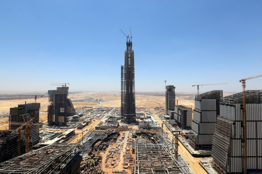 Photo taken on June 17, 2021 shows the Iconic Tower (C) being topped out at the construction site of the central business district (CBD) project in new administrative capital, Egypt. (Xinhua/Sui Xiankai)