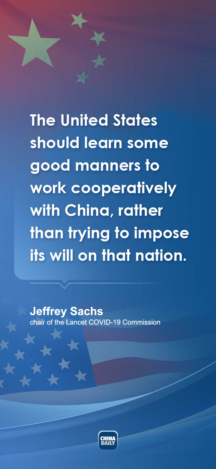 The United States must work with China to find a global solution to end the raging COVID-19 pandemic, said renowned US economist Jeffrey Sachs in an interview with Malaysian media published on Sept 5.