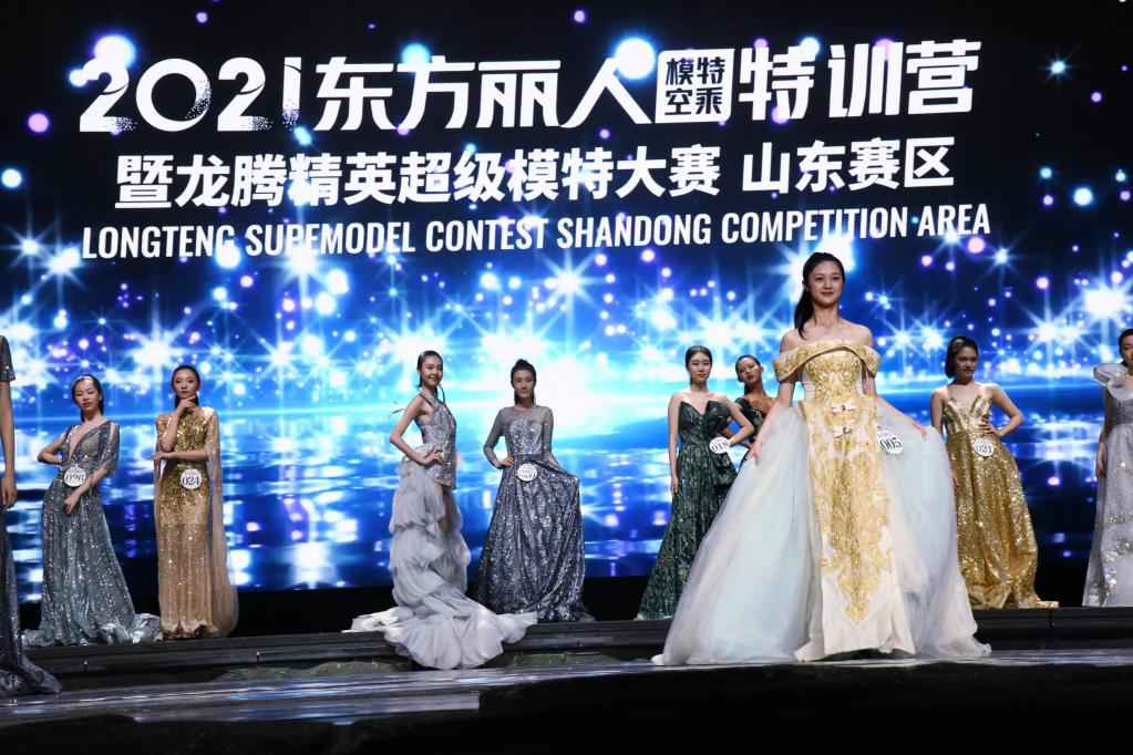 Contestants showcase gowns at the Longteng Supermodel Contest Shandong competition area in Qingdao, east China's Shandong Province, Sept. 11, 2021. (Xinhua/Li Ziheng)