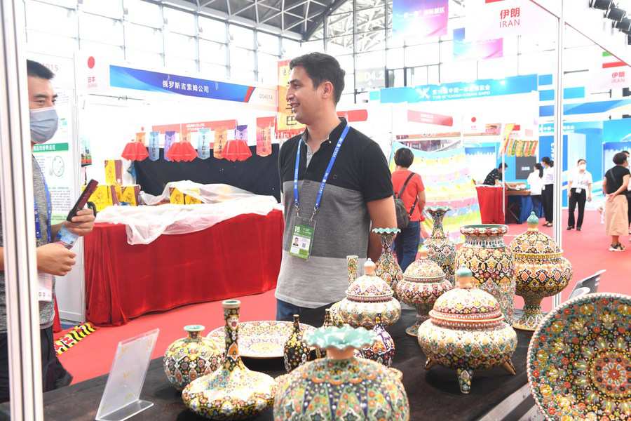 An exhibitor introduces Iranian artworks during the 18th China-ASEANExpo in Nanning, capital of south China's Guangxi Zhuang Autonomous Region, Sept. 12, 2021. (Xinhua/Zhou Hua)