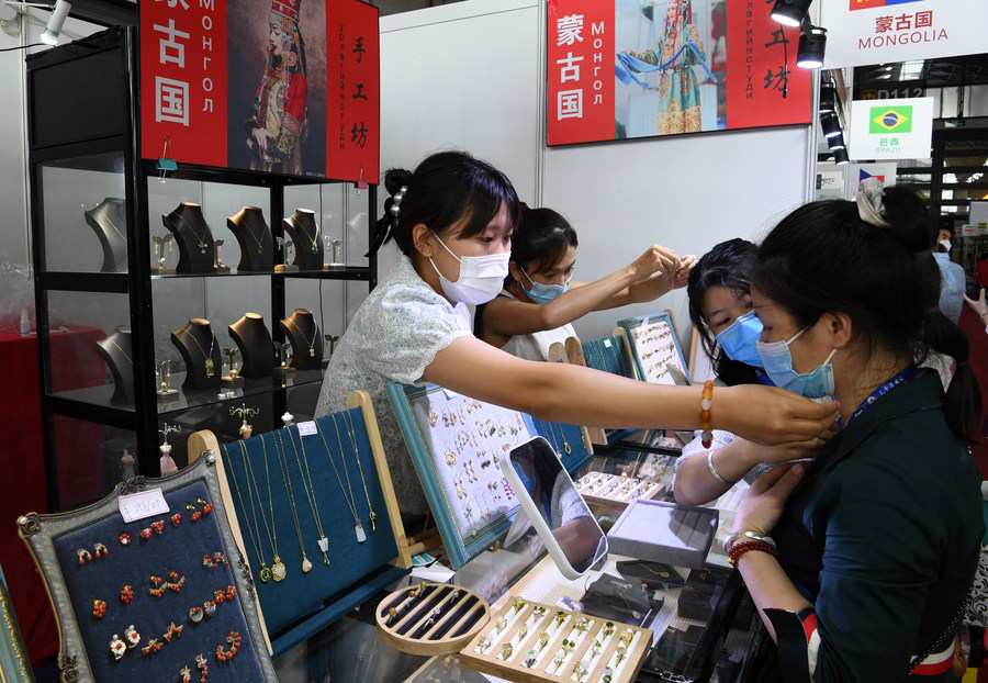 Visitors choose Mongolian jewelry during the 18th China-ASEAN Expo in Nanning, capital of south China's Guangxi Zhuang Autonomous Region, Sept. 11, 2021. (Xinhua/Ma Ning)