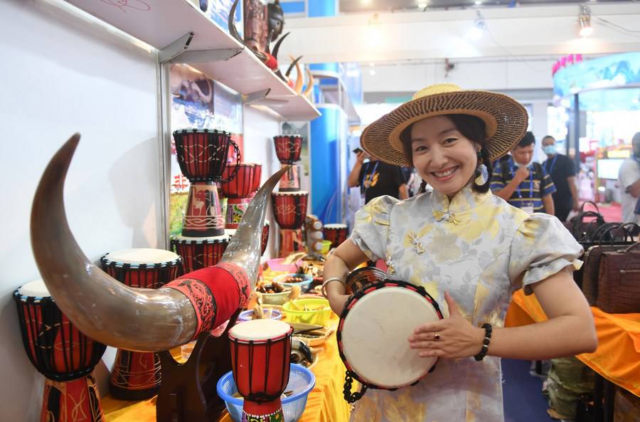 A woman plays the drum at the booth of Ghana during the 18th China-ASEAN Expo in Nanning, capital of south China's Guangxi Zhuang Autonomous Region, Sept. 12, 2021. (Xinhua/Lu Boan)